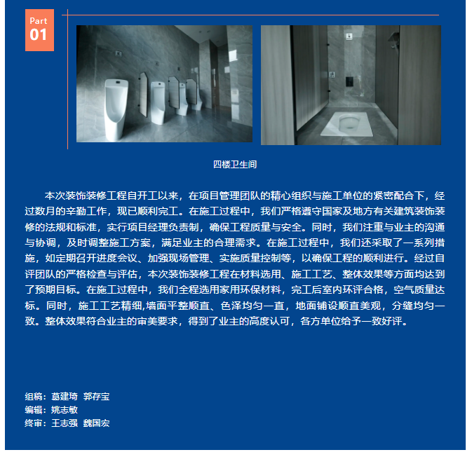 本次装饰装修工程自开工以来,在项目管理团队的精心组织与施工单位的紧密配合下,经过数月的辛勤工作,现已顺利完工。在施工过程中,我们严格遵守国家及地方有关建筑装饰装修的法规和标准,实行项目经理负责制,确保工程质量与安全。
