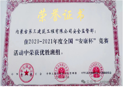 安全监督部近三年荣获全国安全标准化工地,连续五年被内蒙古自治区建筑业协会评为“安全生产优秀企业”,近三年组织策划项目获得“自治区建筑施工安全标准化示范工地”11项,“自治区绿色施工示范工地”5项,因表现突出被全国总工会授予2021—2022年全国“安康杯”优胜班组荣誉称号。