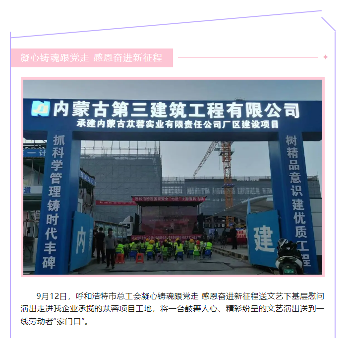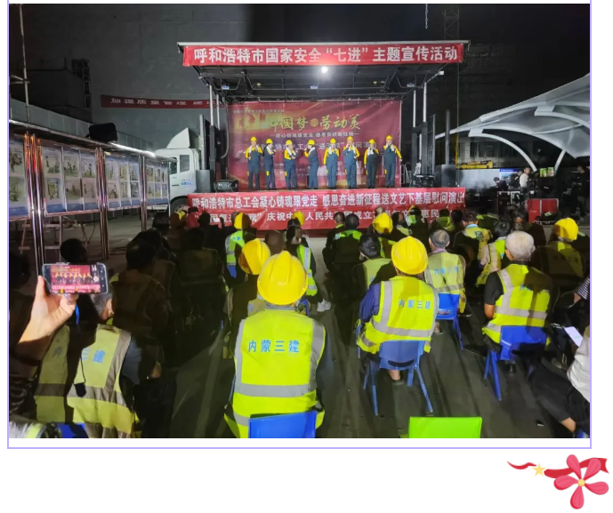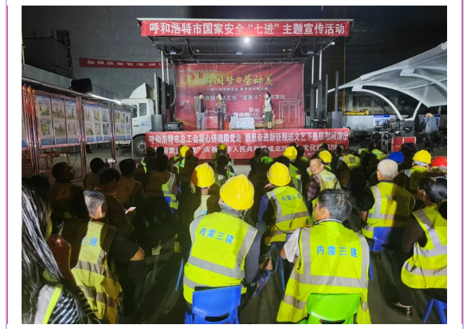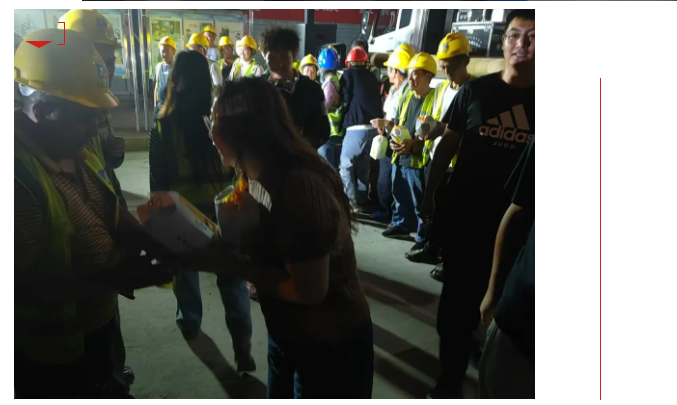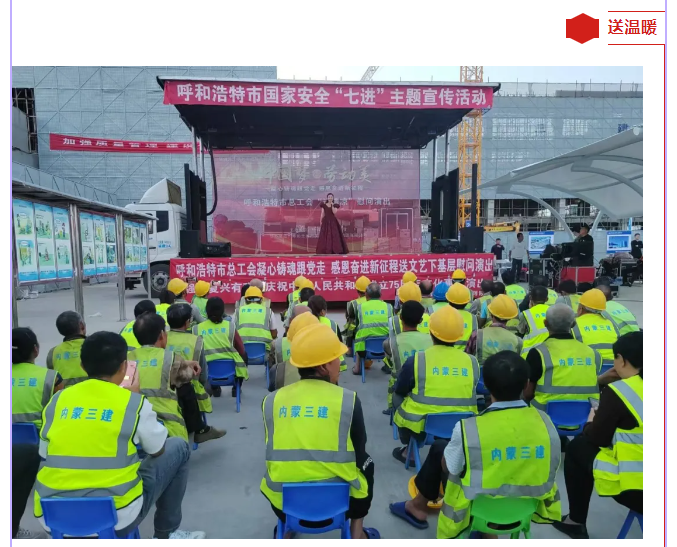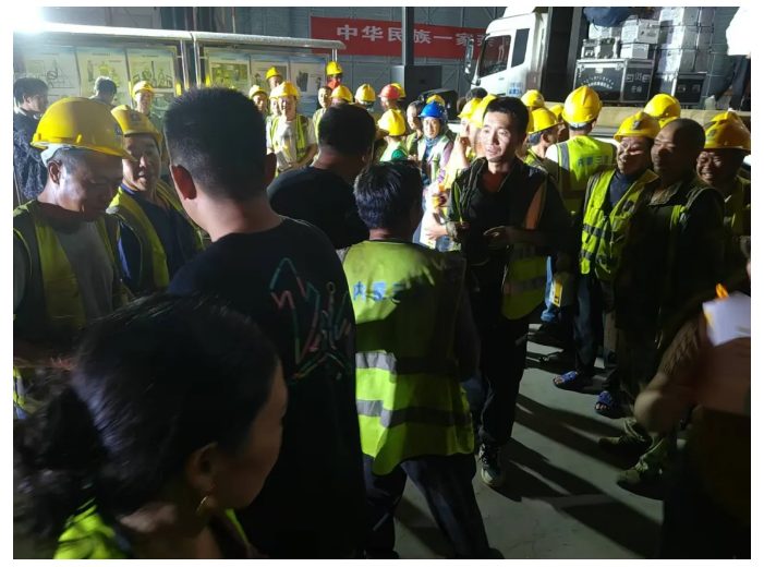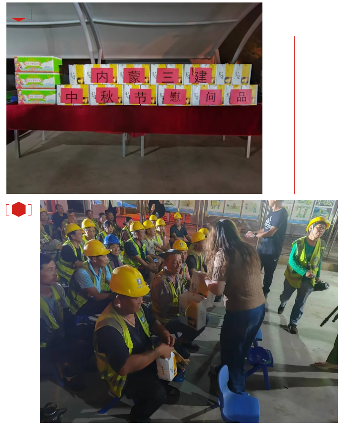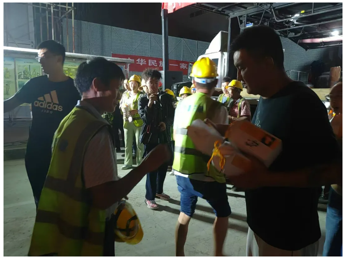 演出结束后内三建公司将为一线工人准备的中秋礼盒送到了工友们的手中,并祝愿他们中秋快乐、家庭幸福、平安喜乐。