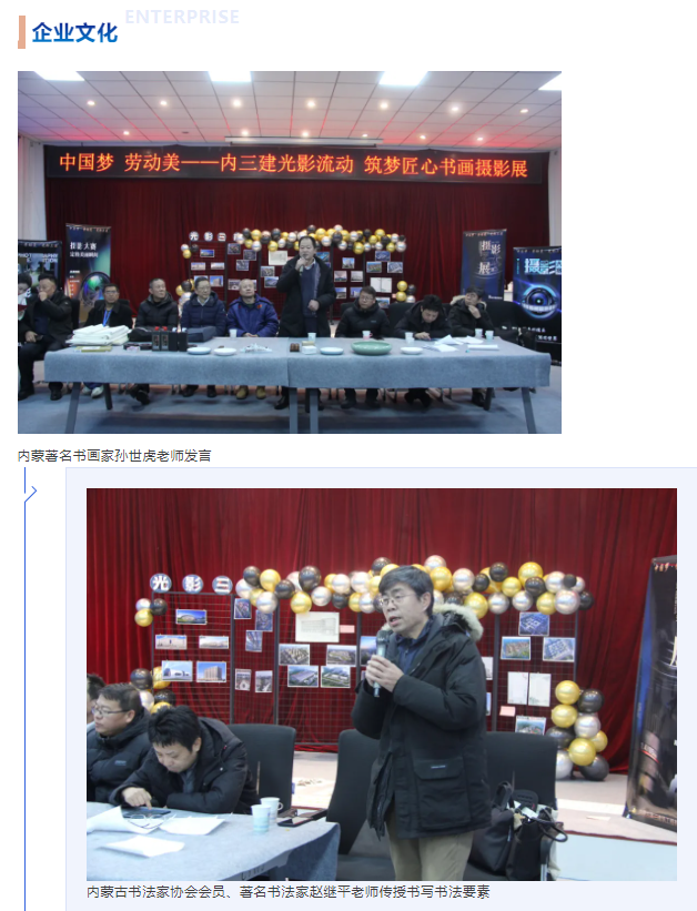 12月20日,为创建学习型企业内涵,丰富员工文化生活,公司举办了“中国梦 劳动美”—内三建光影流动,筑梦匠心书画摄影展,为员工提供展现自我价值的平台,更为促进书画爱好者之间的交流,为精神打底,为人生奠基,与经典为友,与博览同行,书画传情,墨香筑梦。