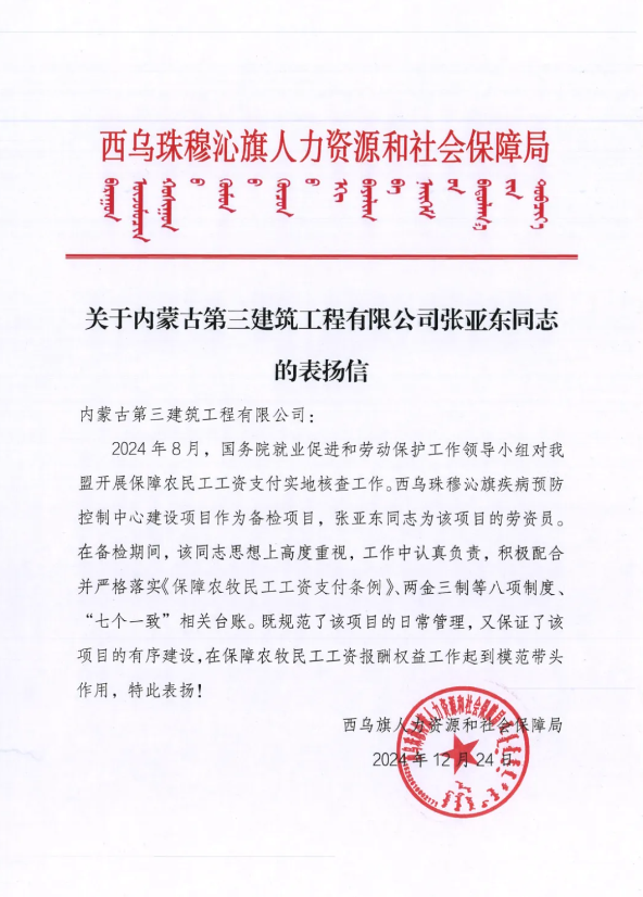 内蒙古第三建筑工程有限公司——西乌珠穆沁旗疾病预防控制中心建设项目部员工张亚东,积极配合上级主管部门开展疾控中心项目《保障农民工工资支付条例》备查工作,受到西乌珠穆沁旗人力资源和社会保障局表扬及肯定。